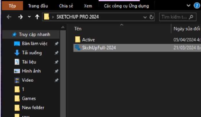 • Bước 6: Sau lúc cài đặt xong, quay lại thư mục “Active” đã giải nén khi đầu. Copy file kích hoạt Patch vào thư mục cài đặt chính của SketchUp Pro 2024.